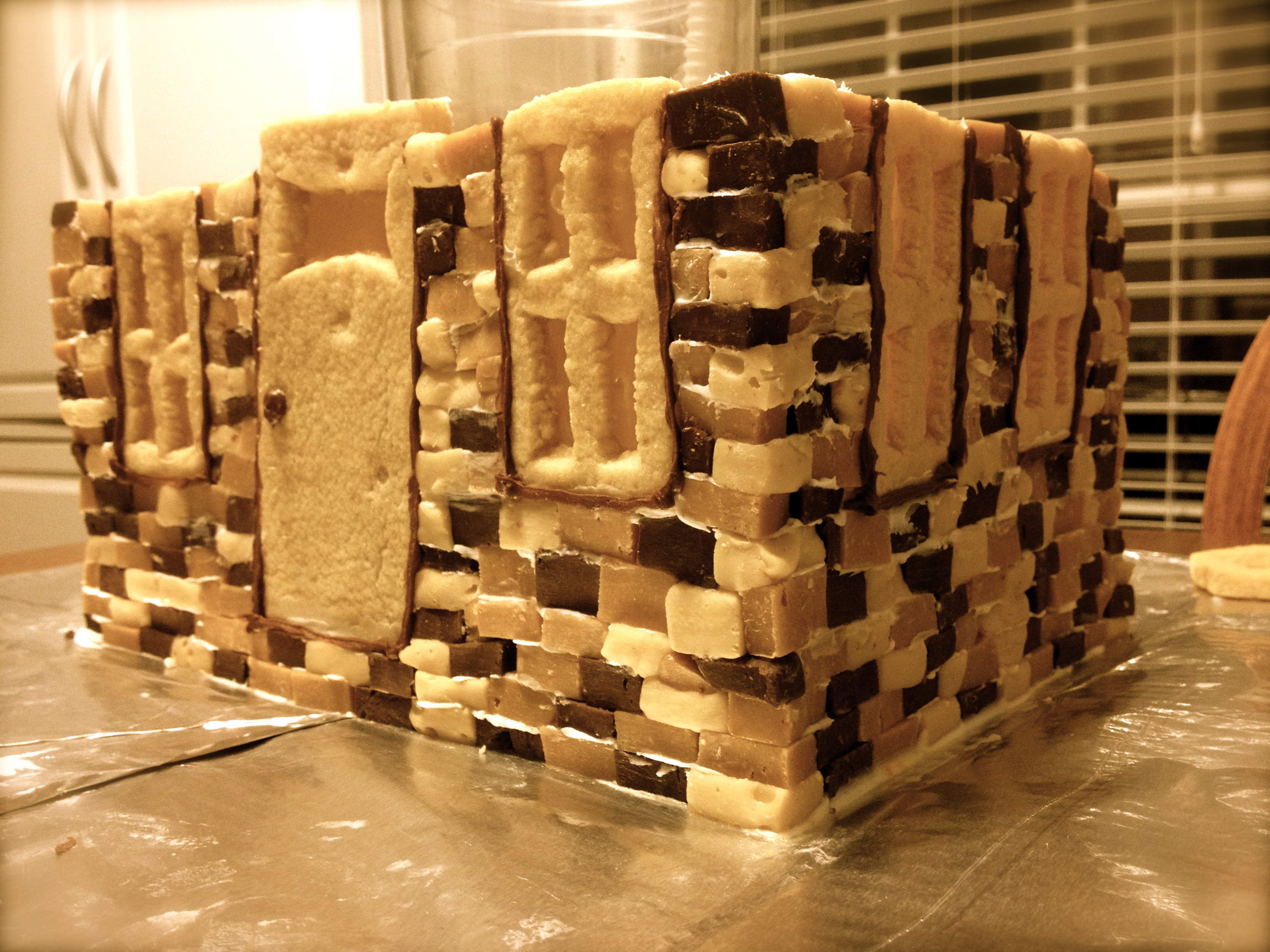 The next day, I sneaked out at lunch to the grocery store and purchased three flavors of chocolate chips. The rest of the lunch break was spent making the easiest possible fudge of three colors – chocolate, peanut butter, and white. Then I let them set in the fridge for a day or so. On other day, I sneaked another 45 minutes or so to make the windows and a door out of cookie dough with some caramel stained glass. I didn’t have a lot of time to think about it, I didn’t measure anything, just made sure all windows were the same size.