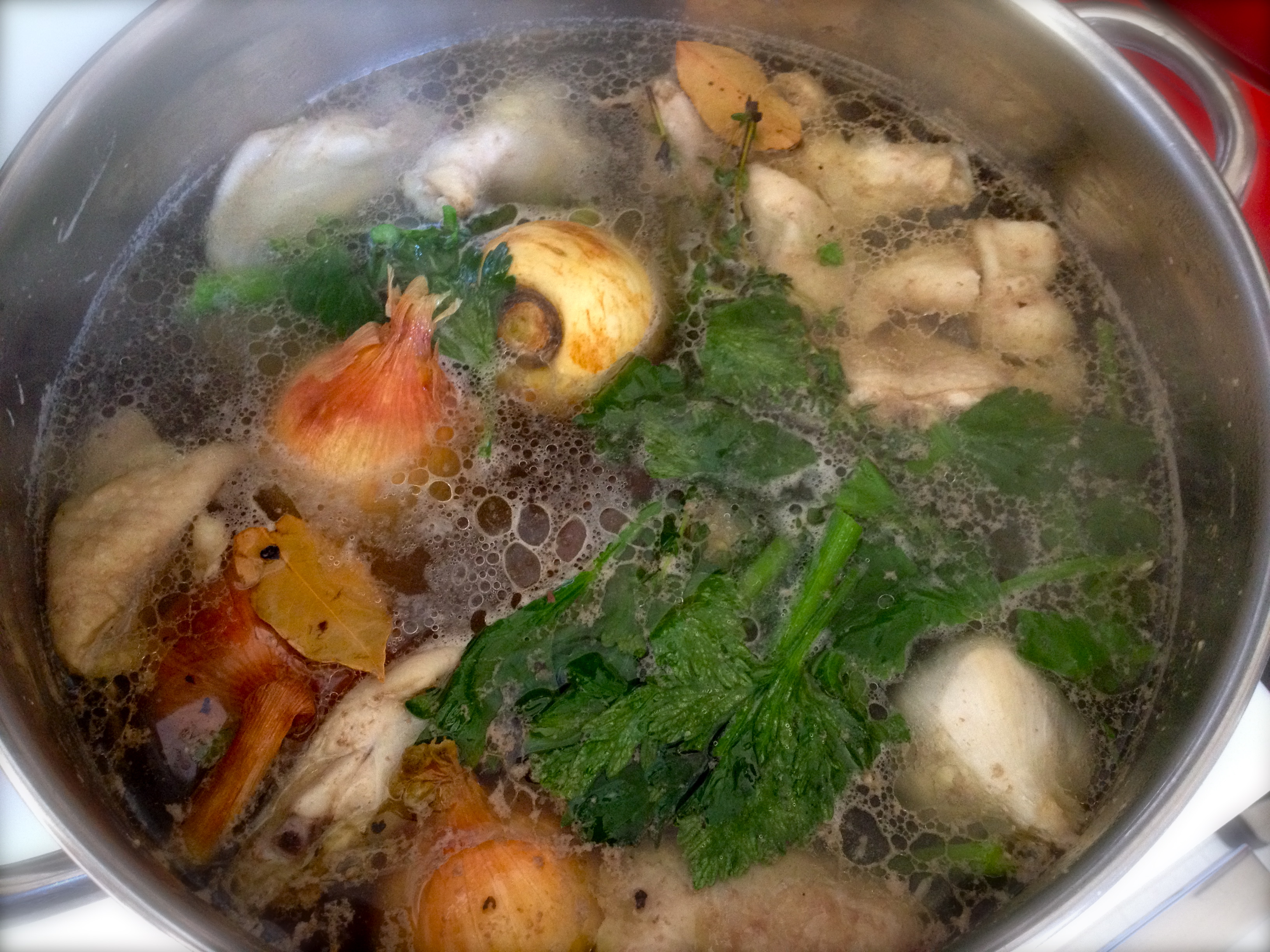You are here: Home » Kitchen Alchemy — Making Chicken Stock » White foam settled after reducing the heat. Simmer mode