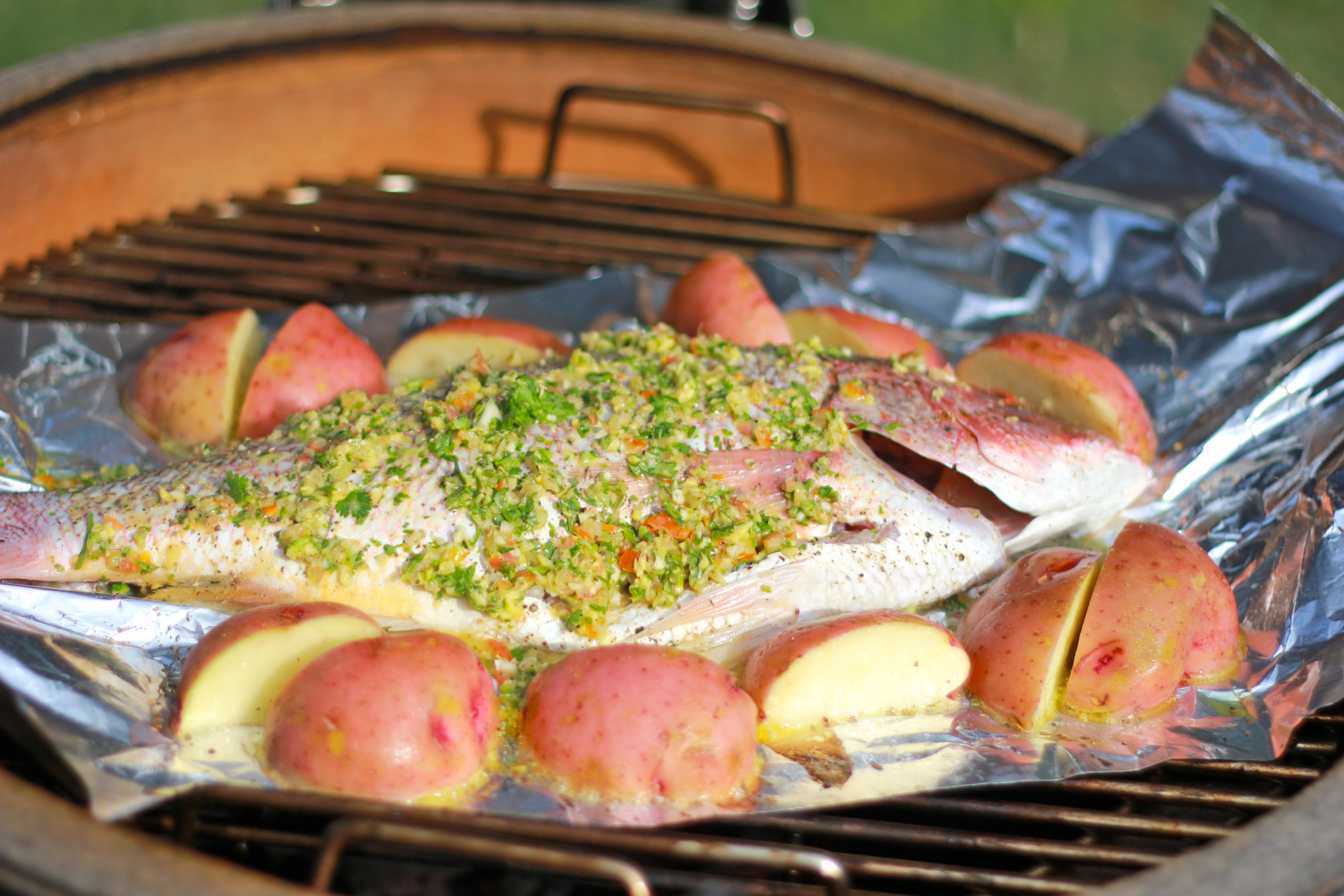 You are here: Home » Asian Inspired Roasted Red Snapper & Braised Bok Choi » Snapper and potatores, arranged on our new Kamado grill