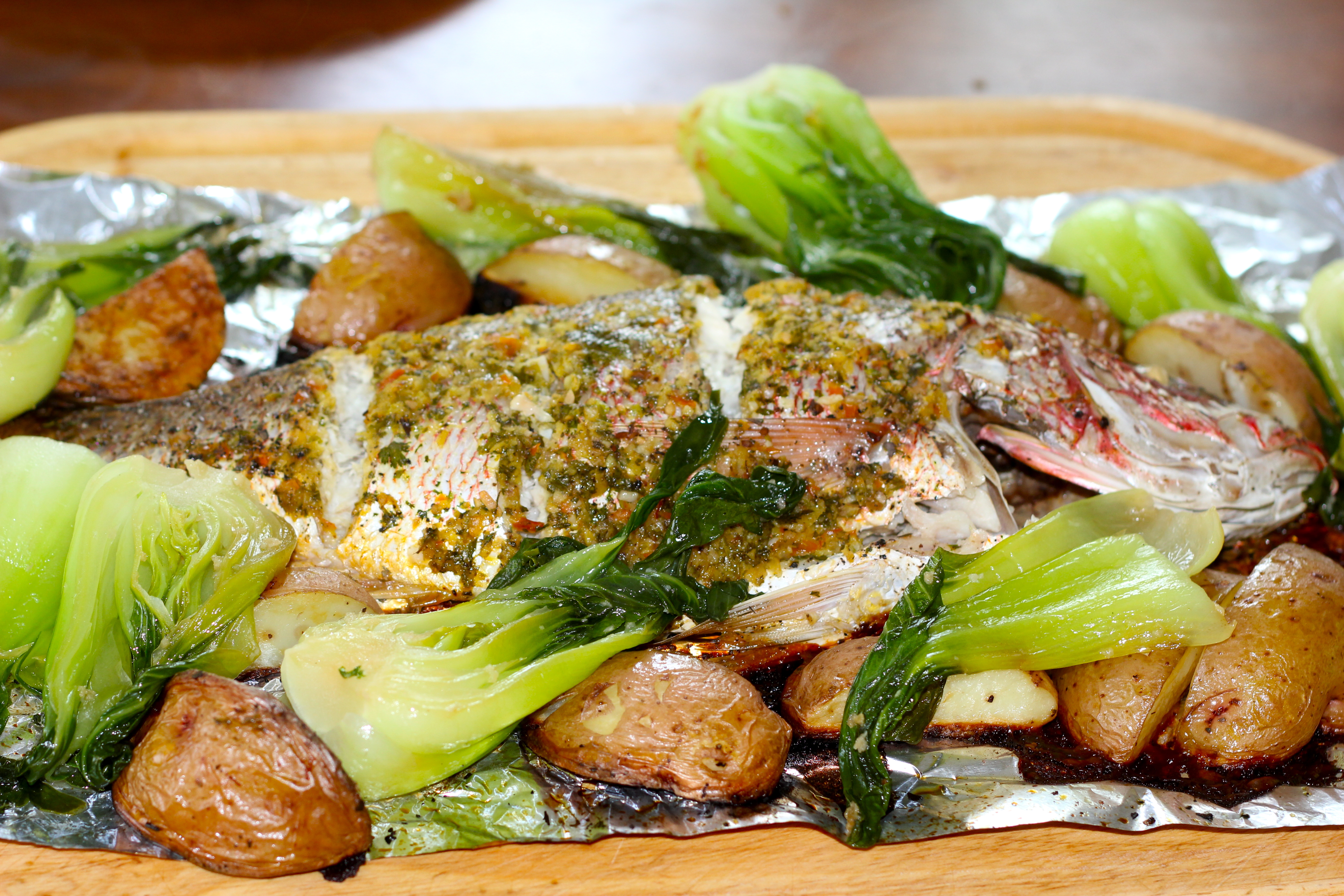 You are here: Home » Asian Inspired Roasted Red Snapper & Braised Bok Choi » Red Snapper with potatoes and braised Bok Choi, ready to serve