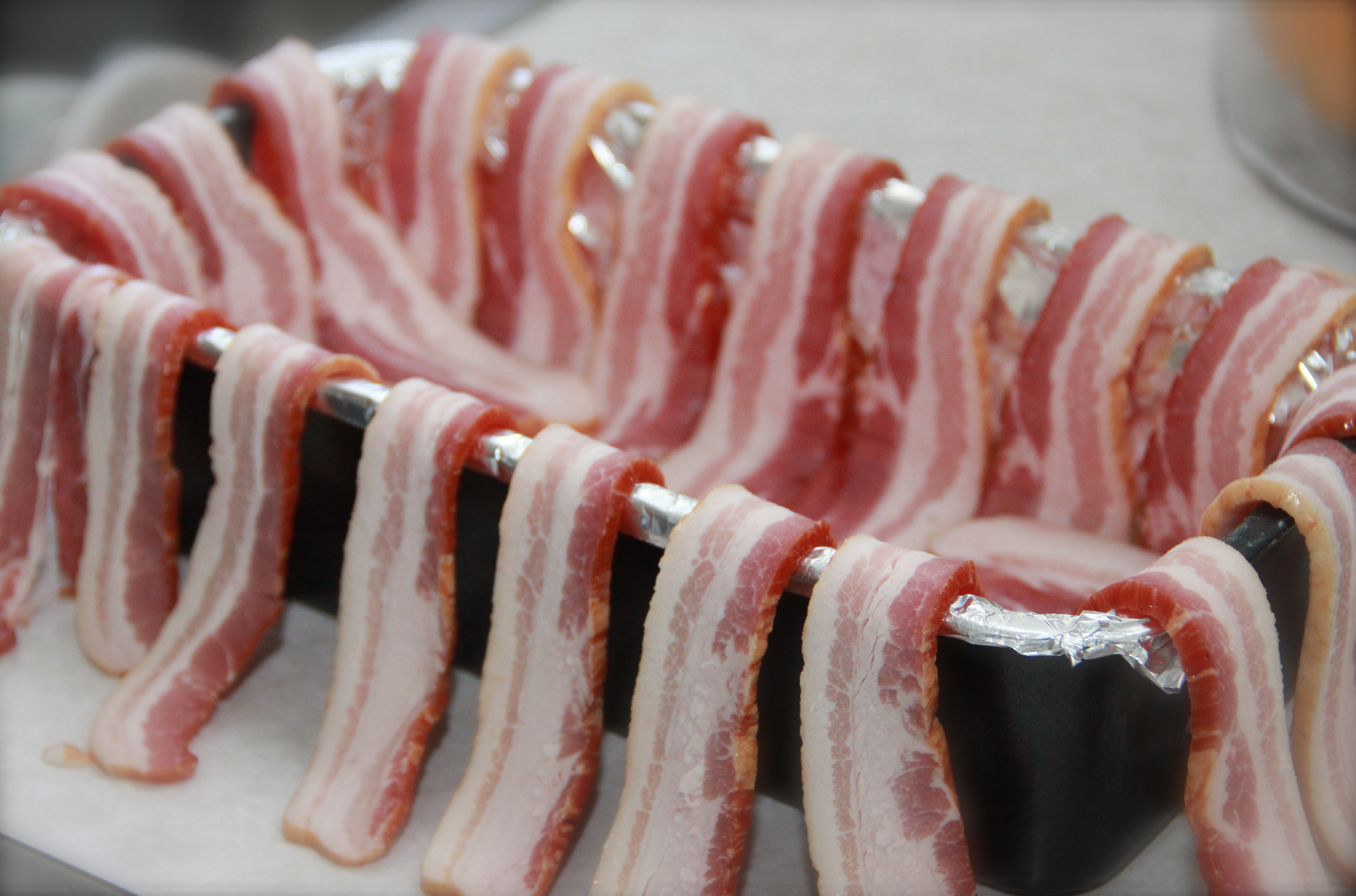 You are here: Home » Terrine Incognita — Making Rabbit Terrine » Meatloaf mold lined with bacon slices