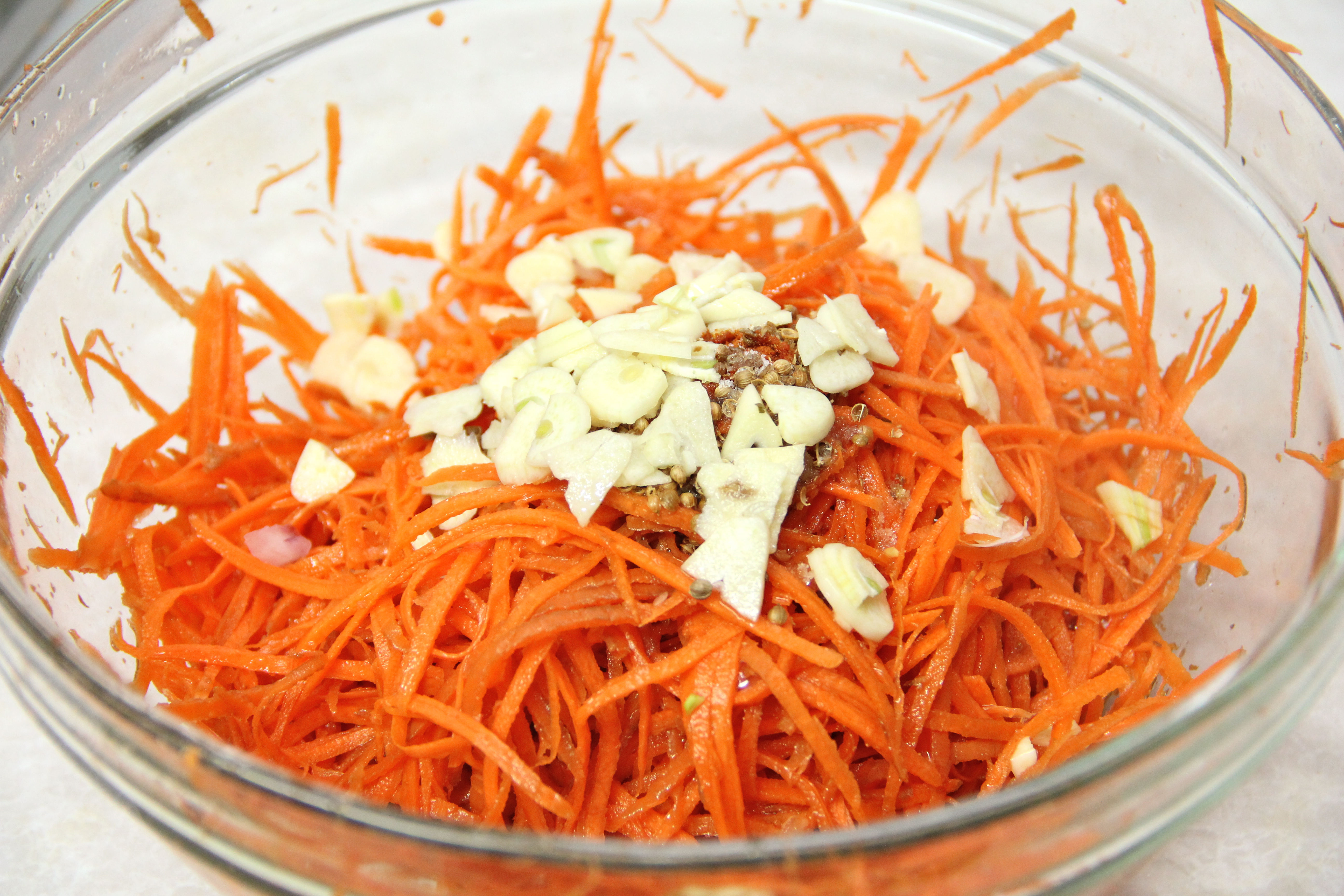 You are here: Home » Salad Challenge, Day 6: Korean Carrot Salad » Spices and garlic heaped atop of the julienned carrots