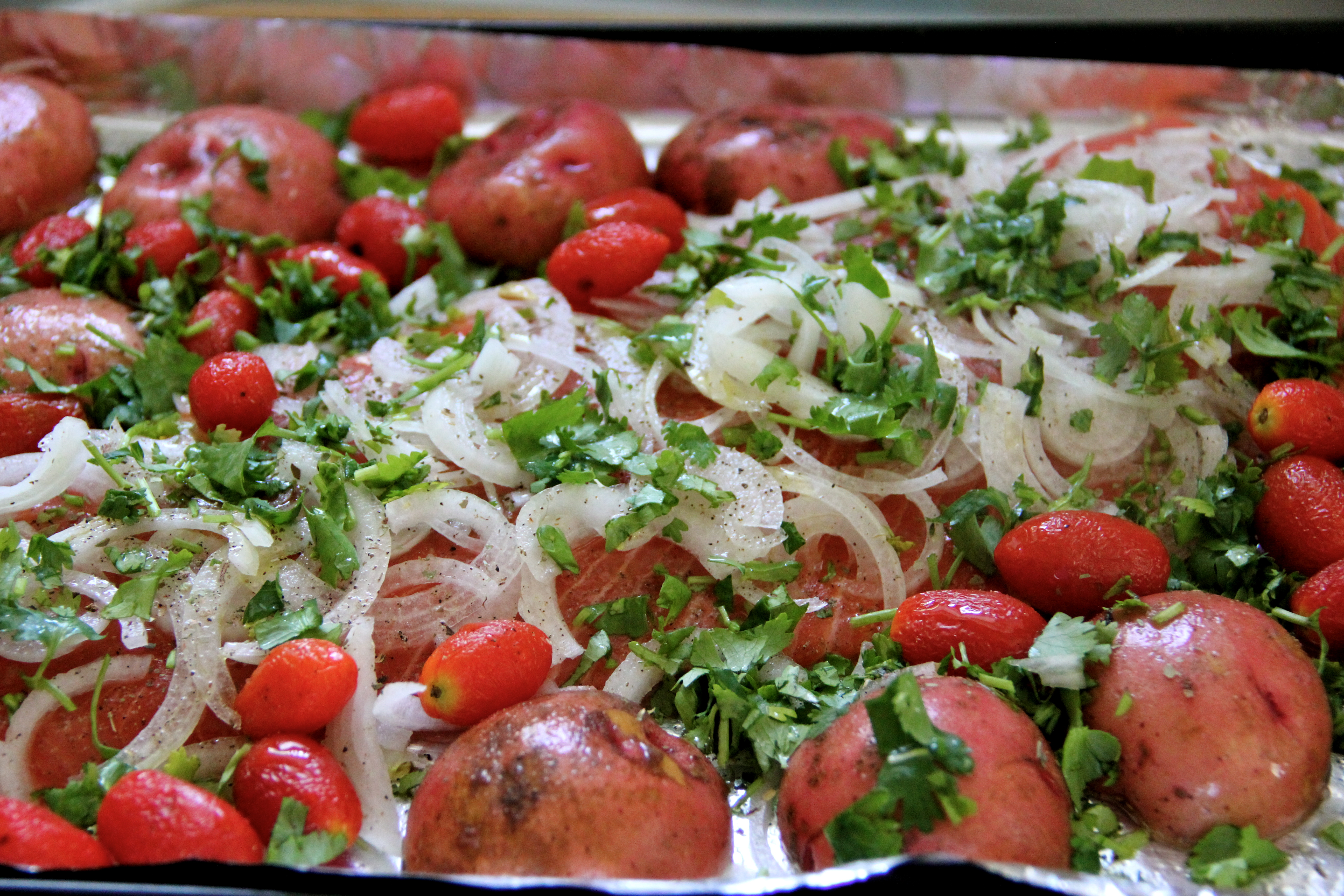 Salmon and vegetables arranged on a baking tray