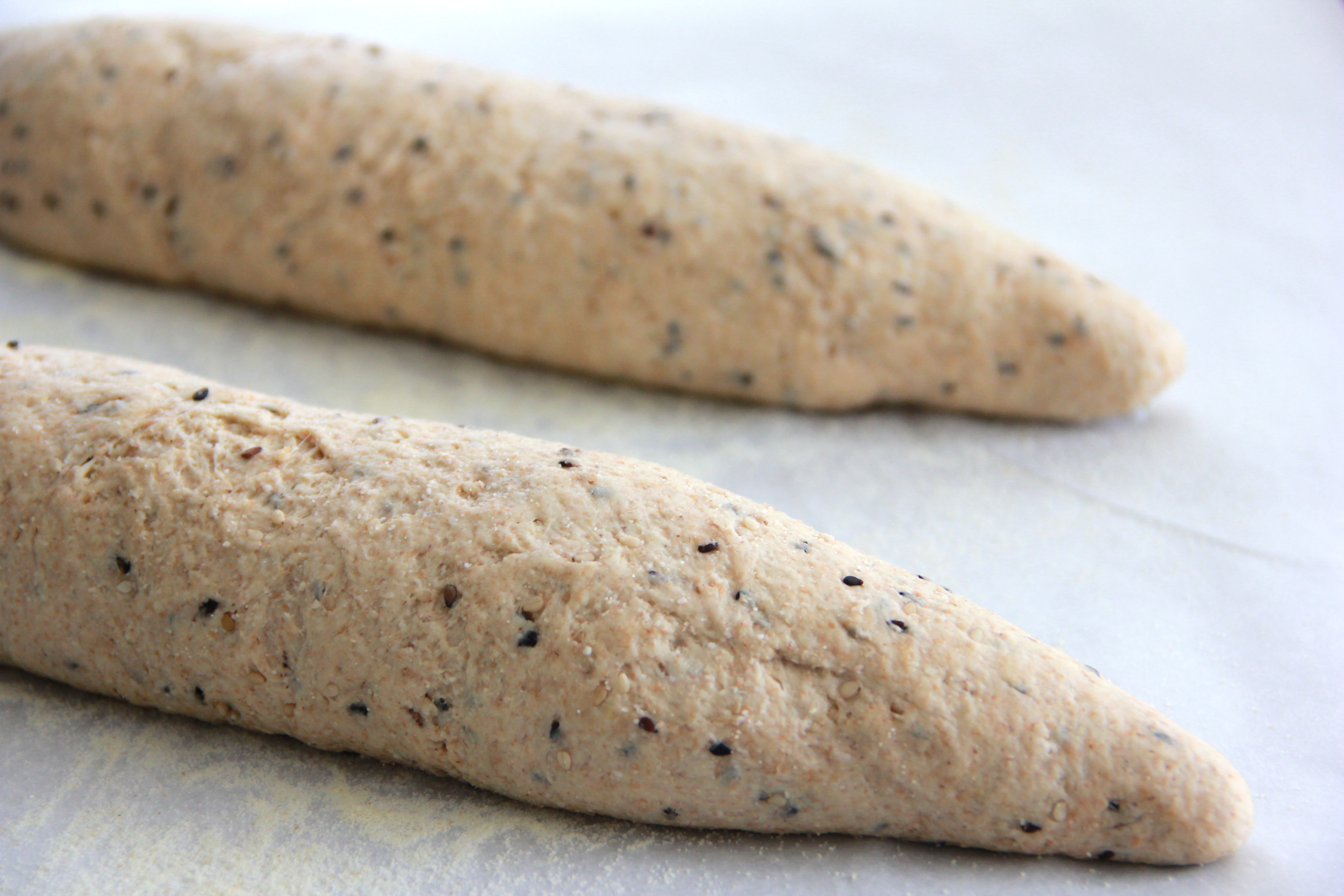You are here: Home » Beyond The Wheat: Semolina & Spelt Bread With Sesame Seed » 4S Bread dough after shaping into pointy batards